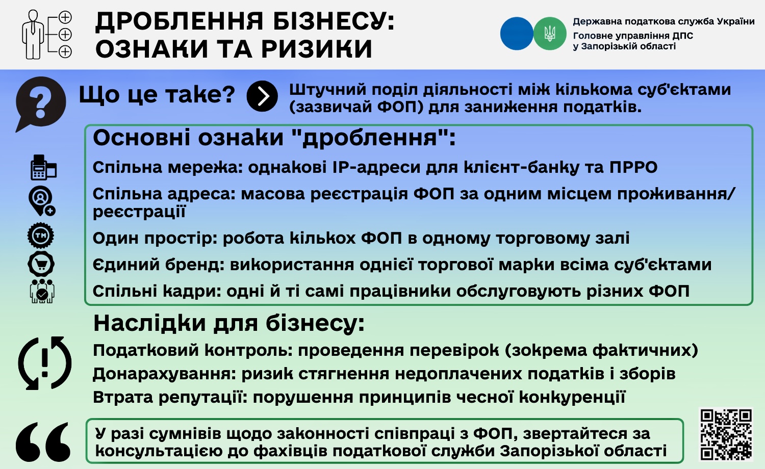 Звертаємо увагу платників податків на неприпустимість штучного «дроблення бізнесу», при якому відбувається поділ єдиного бізнесу на кілька окремих суб'єктів (найчастіше ФОП) для уникнення сплати податкових зобов’язань, що виникали б при роботі в статусі єдиної юридичної особи на загальній системі оподаткування.