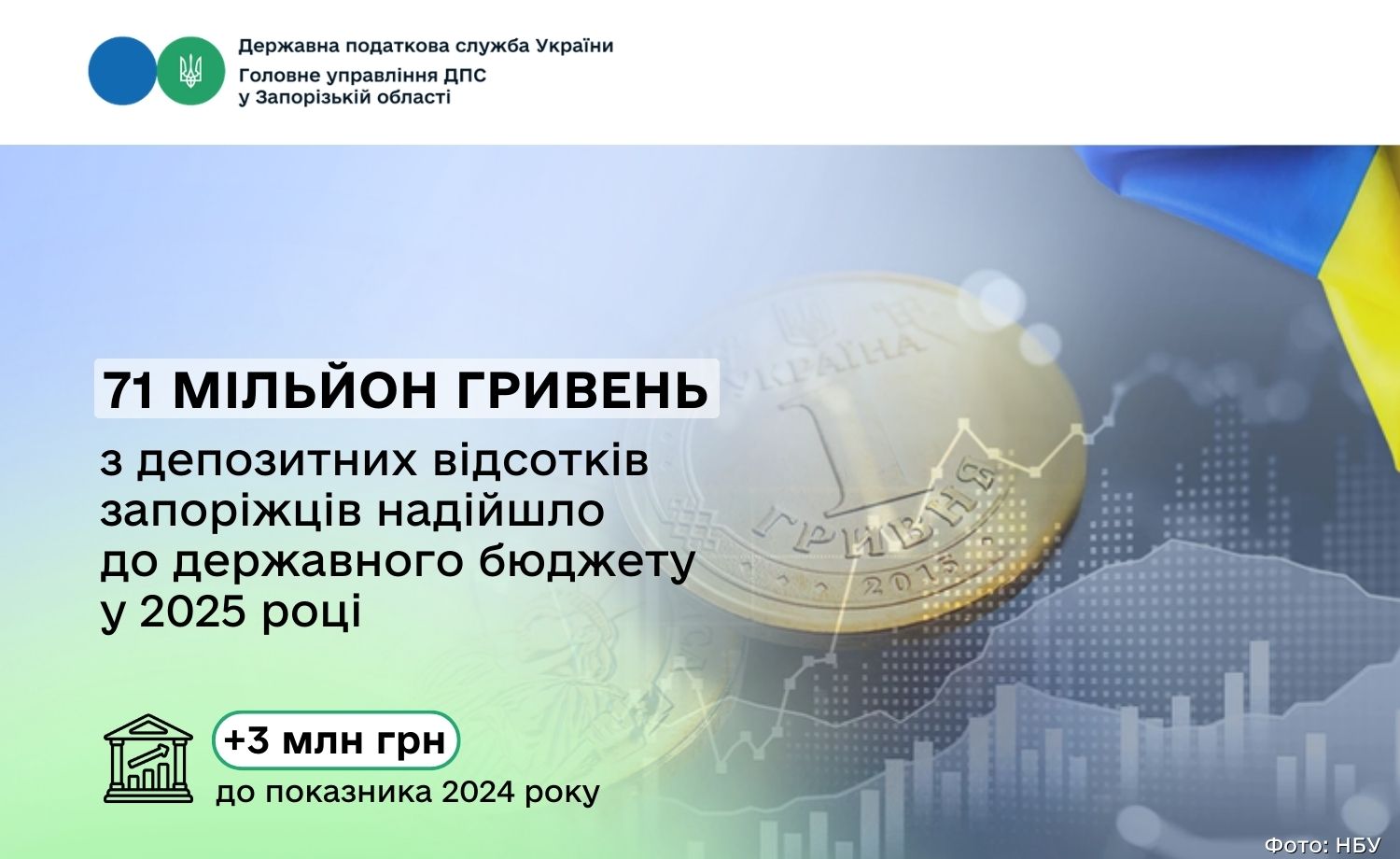 У 2025 році з нарахованих банківських відсотків запорізьких вкладників фінансові установи сплатили до державного бюджету 71 мільйон гривень податку на доходи фізичних осіб. Як зазначила начальниця Головного управління ДПС у Запорізькій області Оксана Федорова, порівняно з 2024 роком надходження зросли на три мільйони гривень.