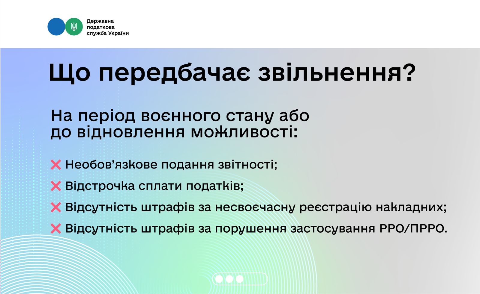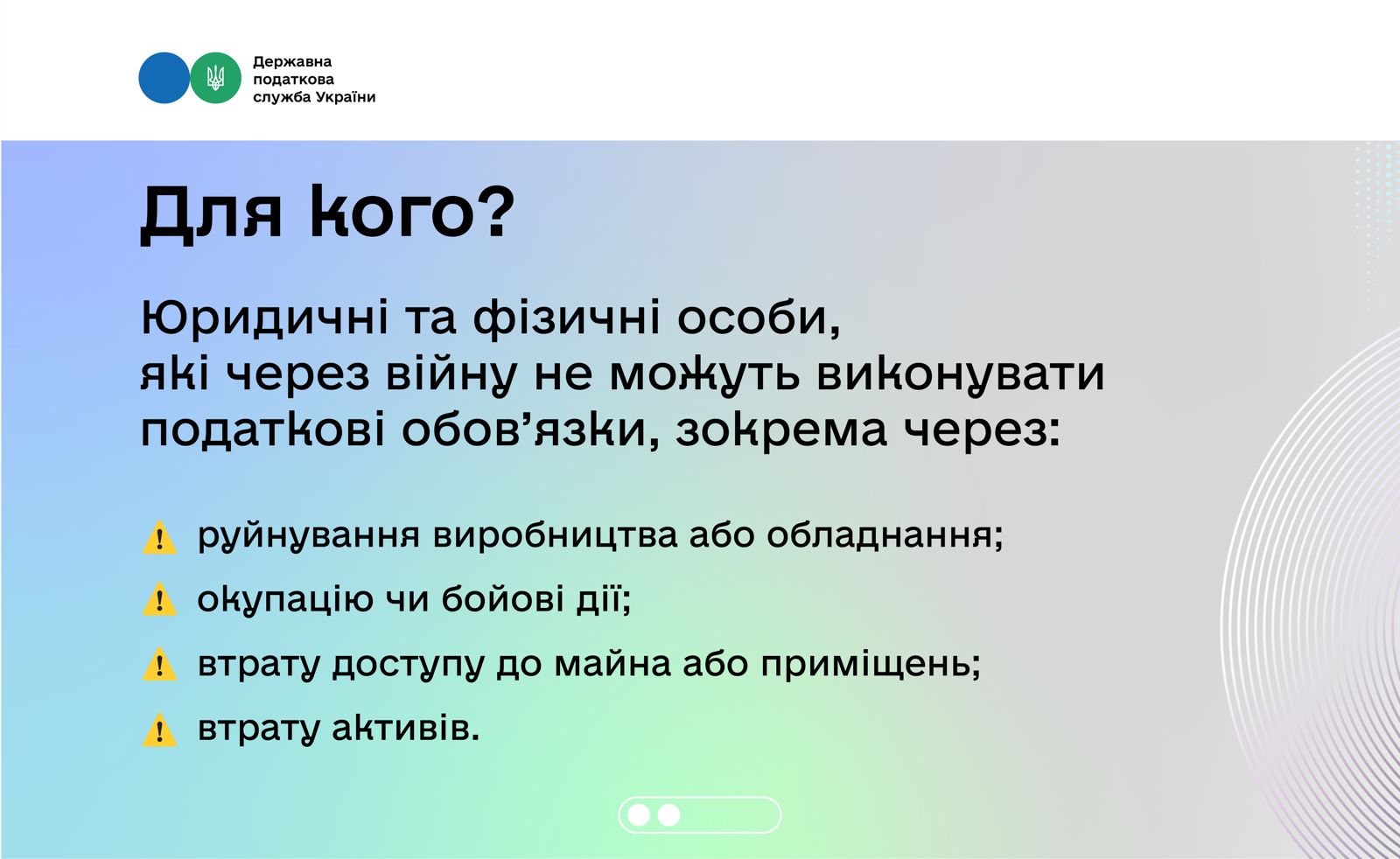 Право на звільнення мають юридичні та фізичні особи, які постраждали від російської агресії і не можуть виконувати свої податкові обов’язки через її наслідки, зокрема: