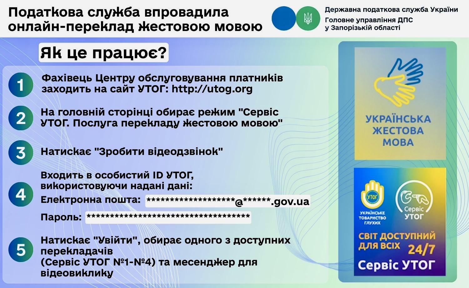 У межах співпраці із Запорізькою обласною організацією Українського товариства глухих у Центрах обслуговування платників податкової служби регіону запроваджено нову послугу – онлайн-переклад жестовою мовою. Це рішення дозволяє людям із порушеннями слуху комфортно отримувати консультації, адміністративні та інші послуги.