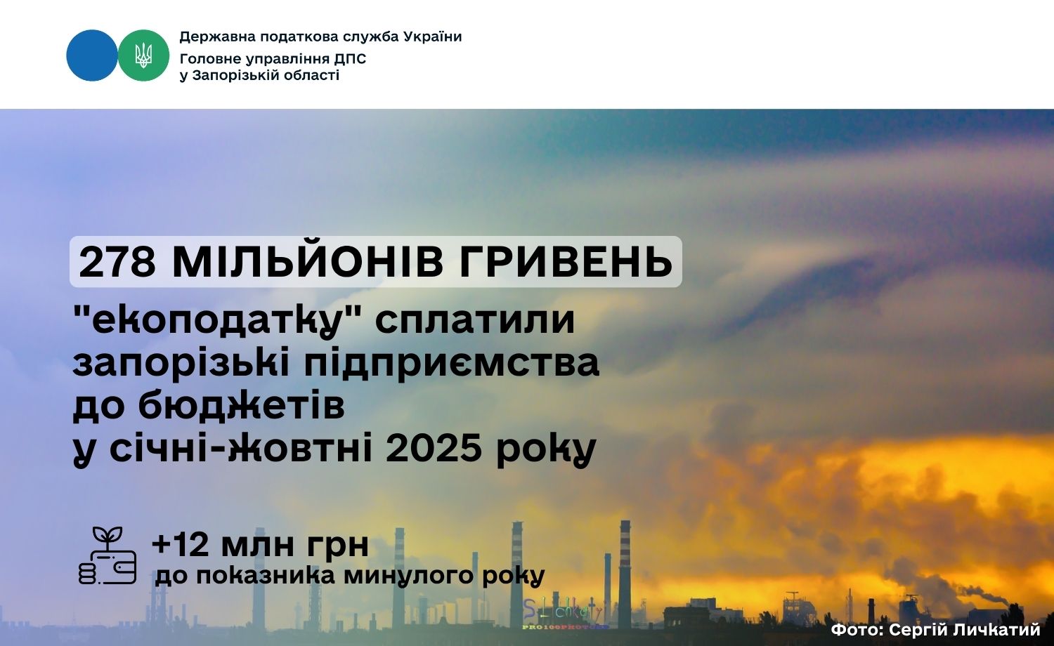 З початку року запорізькі підприємства сплатили до бюджетів усіх рівнів 278 мільйонів 500 тисяч гривень екологічного податку. Як повідомила начальниця Головного управління ДПС у Запорізькій області Оксана Федорова, рівень надходжень аналогічного періоду минулого року перевищено на 12 мільйонів 108 тисяч гривень.