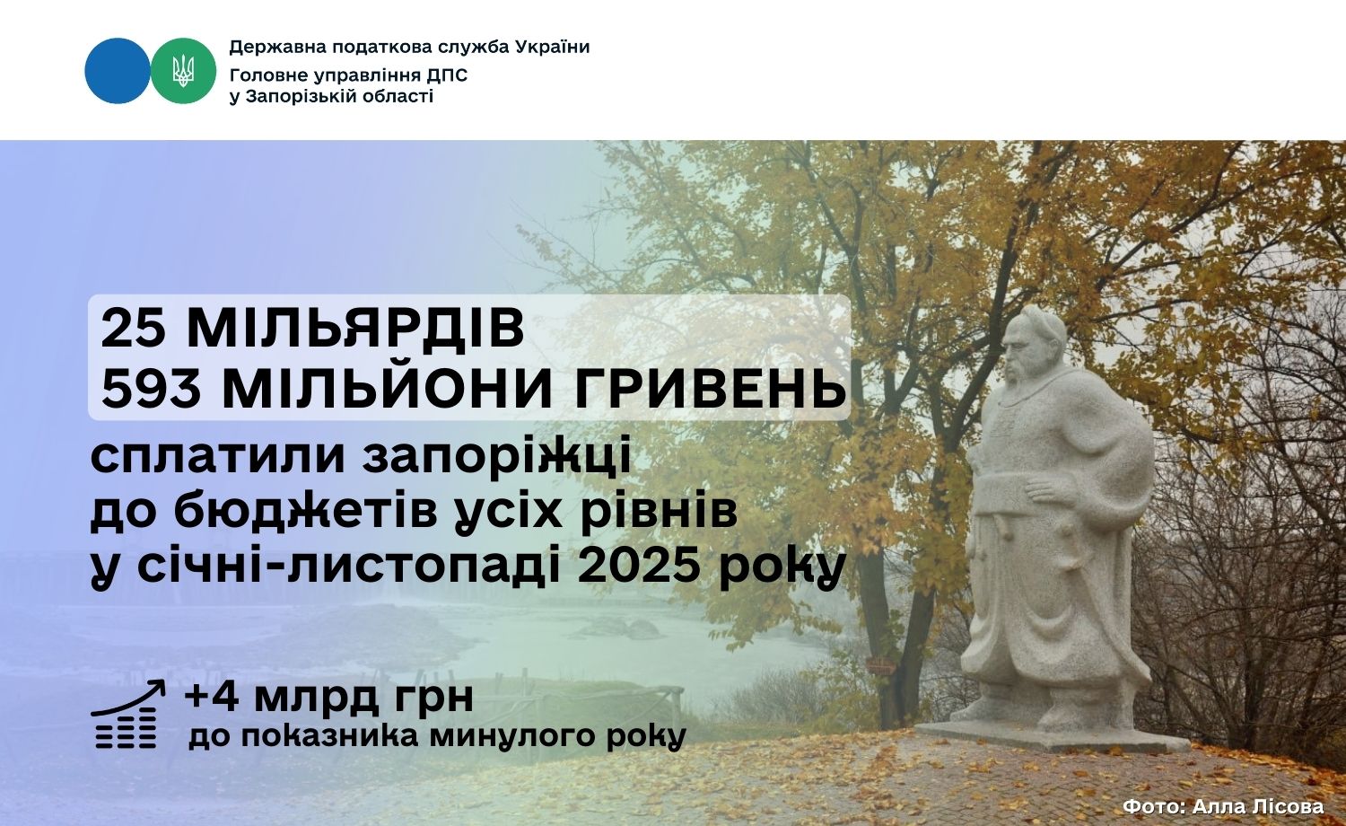 У січні-листопаді платники податків регіону забезпечили до бюджетів усіх рівнів 25 мільярдів 593 мільйони гривень. Як повідомила начальниця Головного управління ДПС у Запорізькій області Оксана Федорова, надходження аналогічного періоду 2024 року перевищено на 4 мільярди гривень або майже на 19 відсотків.