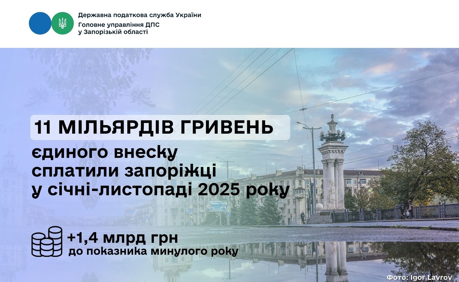 За одинадцять місяців платники податків регіону сплатили до пенсійного та соціальних фондів 11 мільярдів 55 мільйонів гривень єдиного внеску на загальнообов'язкове державне соціальне страхування. Як зазначила начальниця Головного управління ДПС у Запорізькій області Оксана Федорова, порівняно з аналогічним періодом 2024 року надходження зросли на 1 мільярд 424 мільйони гривень або майже на 15 відсотків.