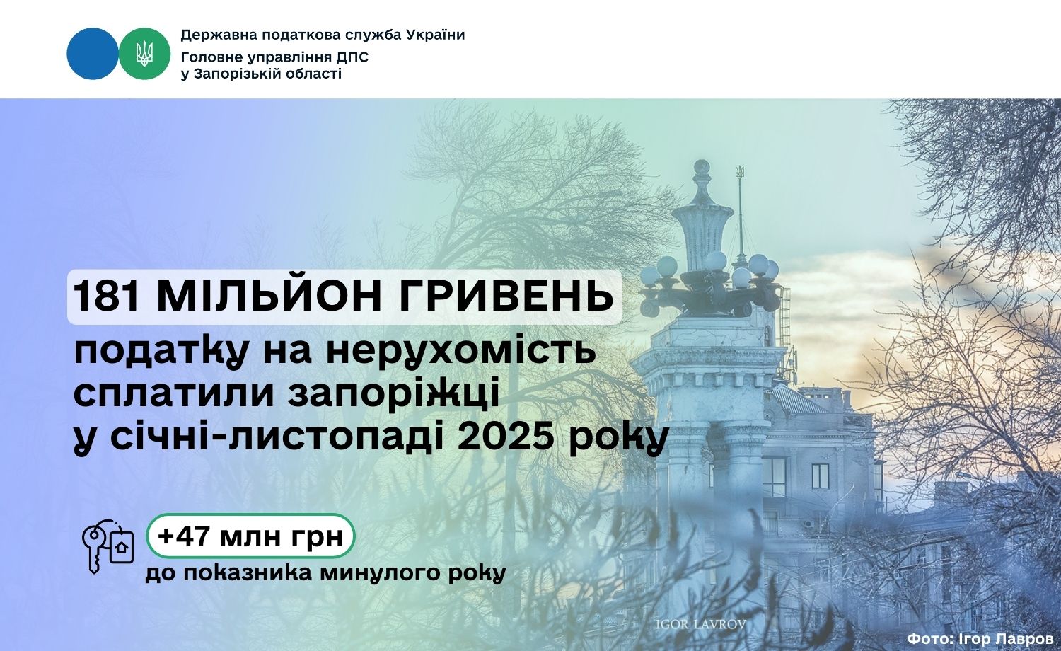 У січні-листопаді до місцевих бюджетів регіону надійшло 181 мільйон 500 тисяч гривень податку на нерухоме майно. Як повідомила начальниця Головного управління ДПС у Запорізькій області Оксана Федорова, порівняно з минулим роком надходження зросли на 47 мільйонів гривень або на 35 відсотків.