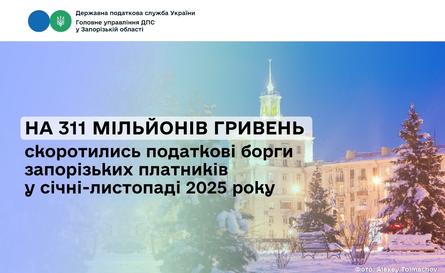 Протягом січня-листопада завдяки застосуванню передбачених законодавством заходів до бюджетів усіх рівнів надійшло 311 мільйонів 300 тисяч гривень податкової заборгованості. Зокрема, державний бюджет отримав понад 117 мільйонів, до місцевих бюджетів громад Запорізької області спрямовано більше 194 мільйонів гривень.