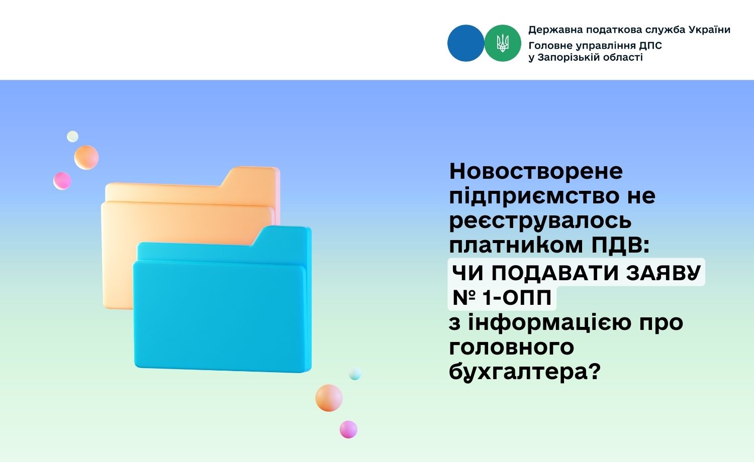 Тобто, після проведення державної реєстрації новостворена юридична особа, яка не реєструвалась платником податку на додану вартість, подає до контролюючого органу заяву за ф. № 1-ОПП з позначкою "Зміна відповідальних осіб: особи, відповідальної за ведення бухгалтерського та/або податкового обліку" з інформацією про головного бухгалтера у 10-денний строк з дня взяття на облік.