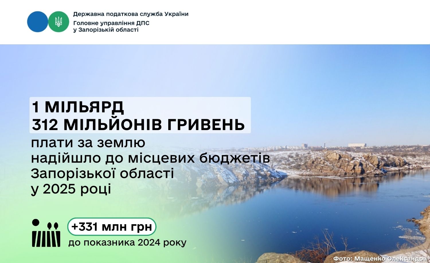 Упродовж минулого року запорізькі власники і користувачі земель спрямували до місцевих бюджетів 1 мільярд 312 мільйонів гривень плати за землю. Як зазначила начальниця Головного управління ДПС у Запорізькій області Оксана Федорова, сплачена сума перевищила показник 2024 року на 331 мільйон гривень або на 34 відсотки.