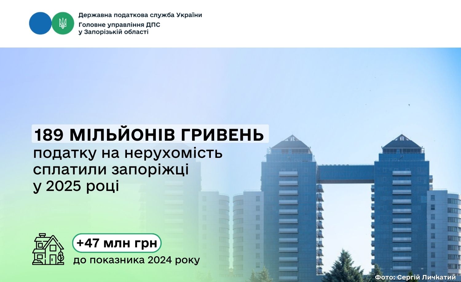 Упродовж минулого року до місцевих бюджетів регіону надійшло понад 189 мільйонів гривень податку на нерухомість. Як повідомила начальниця Головного управління ДПС у Запорізькій області Оксана Федорова, запоріжці збільшили сплату податку до показника 2024 року на 47 мільйонів гривень або на 33 відсотки.