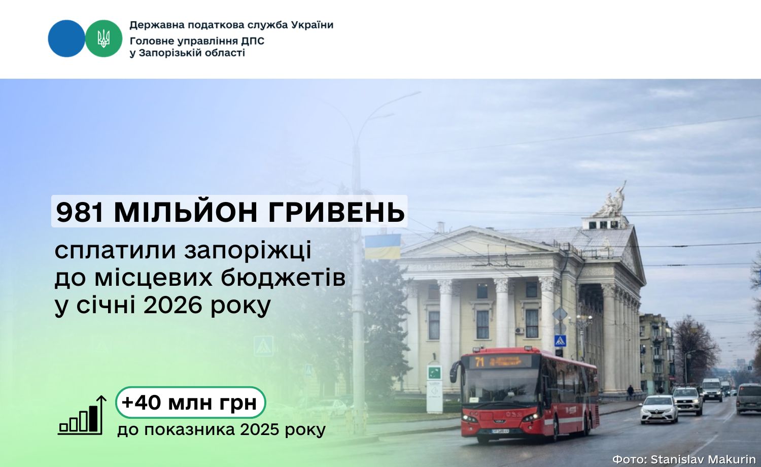 За перший місяць року запоріжці сплатили до місцевих бюджетів регіону 981 мільйон гривень податків. Як зазначила начальниця Головного управління ДПС у Запорізькій області Оксана Федорова, зростання показника порівняно з минулорічним склало понад 40 мільйонів гривень або десять відсотків.