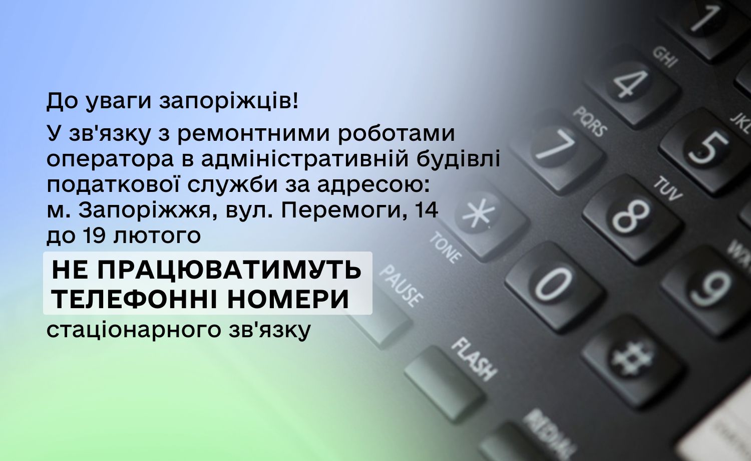У зв'язку із аварійними ремонтними роботами оператора в адміністративній будівлі податкової служби Запорізької області за адресою: м. Запоріжжя, вул. Перемоги, 14 не працюють телефонні номери стаціонарного зв'язку.