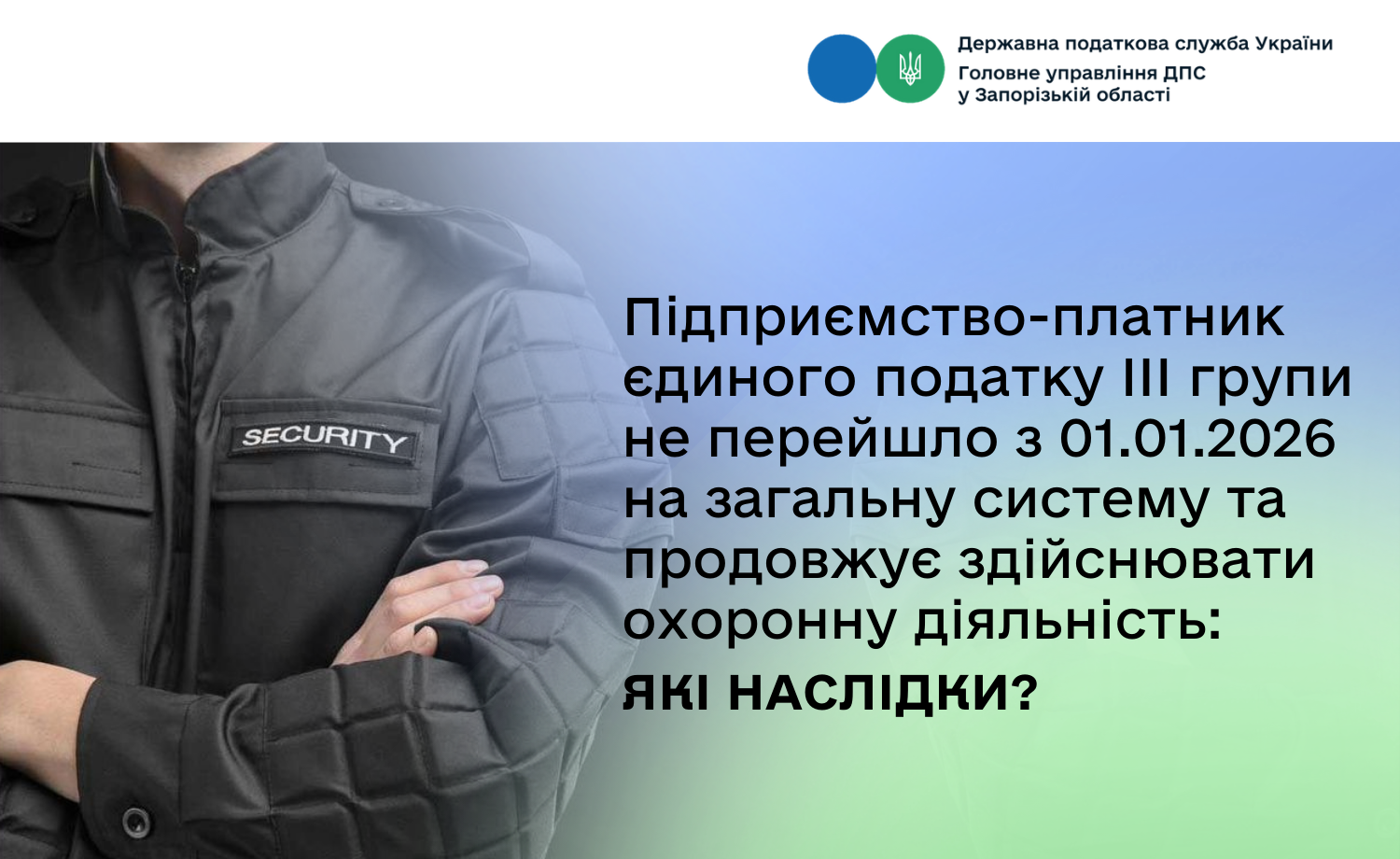 Відповідно до Закону України від 03 грудня 2025 року № 4698-ІХ «Про внесення змін до Податкового кодексу України та інших законів України щодо особливостей оподаткування банків податком на прибуток підприємств у 2026 році та перенесення строків введення в дію Електронної системи обігу алкогольних напоїв, тютюнових виробів та рідин, що використовуються в електронних сигаретах», який набрав чинності з 26.12.2025, з 01.01.2026 перелік видів діяльності, заборонених для здійснення платниками єдиного податку, доповнено охоронною діяльністю.