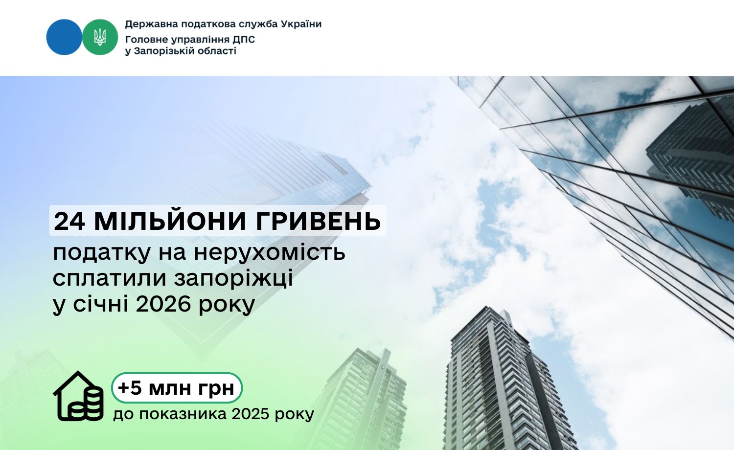 У січні запоріжці сплатили до місцевих бюджетів 24 мільйони гривень податку на нерухоме майно. Як повідомила начальниця Головного управління ДПС у Запорізькій області Оксана Федорова, минулорічні надходження перевищено на 5 мільйонів гривень або на 26 відсотків.