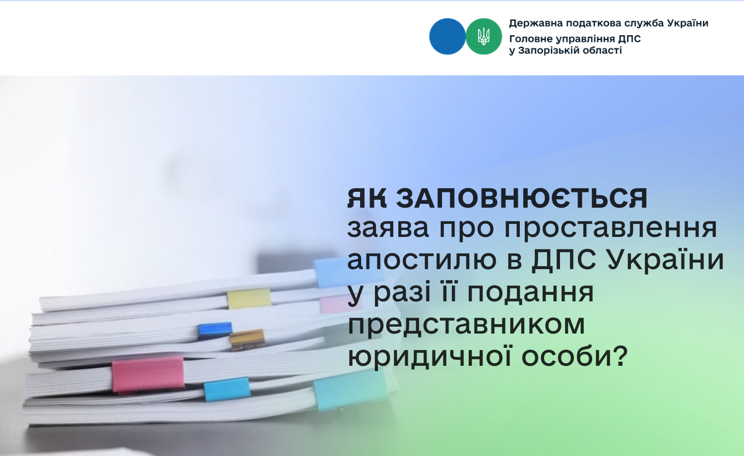Рекомендована форма заяви про проставлення апостилю в Державній податковій службі України на офіційних документах, призначених для використання на території інших держав для юридичної особи розміщена на вебпорталі ДПС за посиланням: Головна / Діяльність / Апостиль / Форми Заяв про проставлення апостилю в Державній податковій службі України на офіційних документах, призначених для використання на території інших держав для фізичних та юридичних осіб.