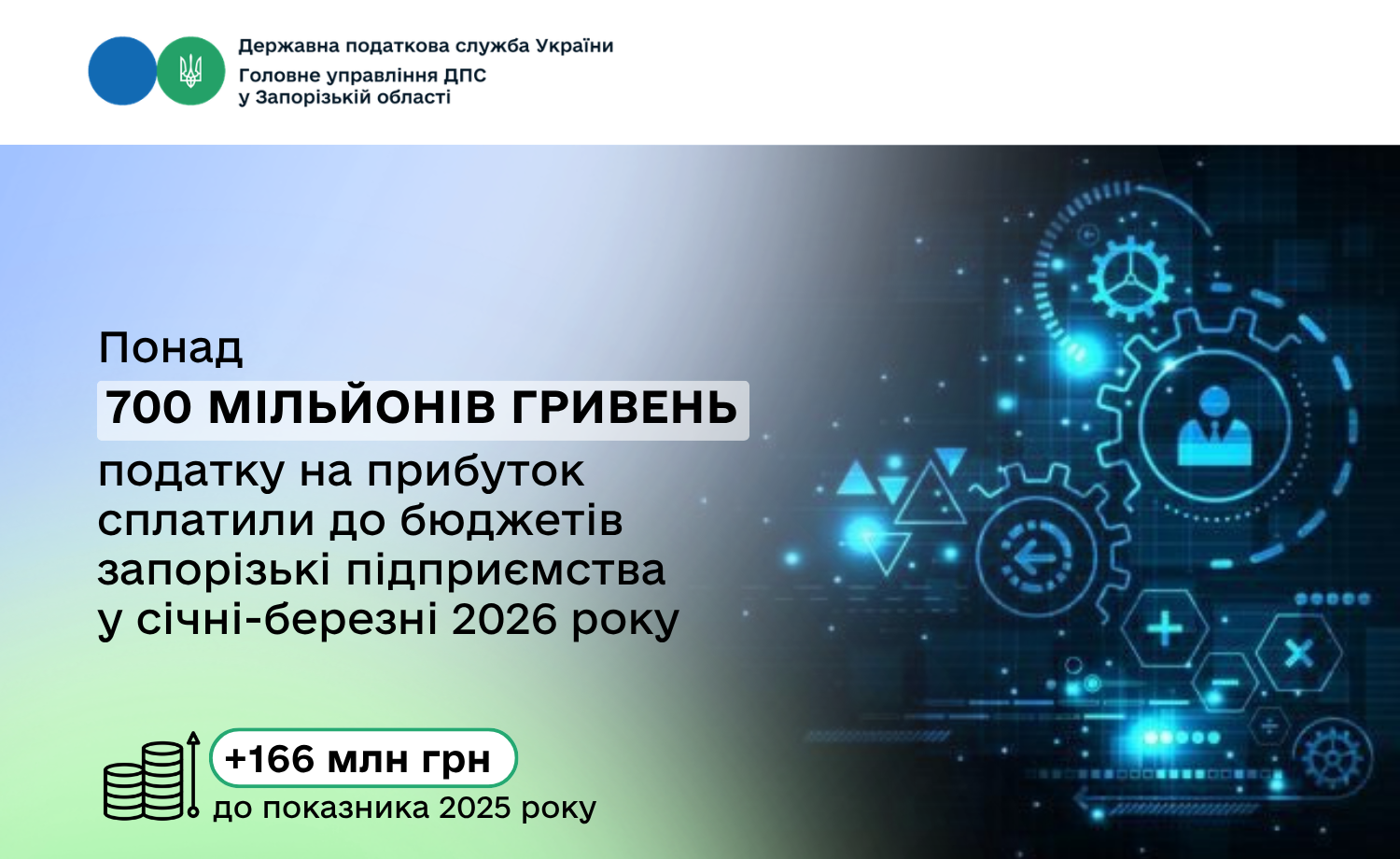 Як повідомила начальниця Головного управління ДПС у Запорізькій області Оксана Федорова, до загального фонду державного бюджету надійшло 629 мільйонів гривень, що майже на 166 мільйонів гривень більше аналогічного періоду минулого року. До місцевих бюджетів спрямовано понад 74 мільйони гривень.