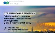 З початку року запорізькі підприємства сплатили до бюджетів усіх рівнів 278 мільйонів 500 тисяч гривень екологічного податку. Як повідомила начальниця Головного управління ДПС у Запорізькій області Оксана Федорова, рівень надходжень аналогічного періоду минулого року перевищено на 12 мільйонів 108 тисяч гривень.