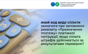 Отже, враховуючи коди, наведені у додатку 1 до Порядку № 148, в залежності від того яка особа (юридична чи фізична) та за результатами яких перевірок (камеральної, документальної, фактичної), проведеними податковими органами сплачуються штрафні санкції, пеня по податкам, зборам та єдиному внеску, у реквізиті «Призначення платежу» платіжної інструкції зазначається код виду сплати: