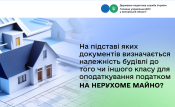 Визначення належності будівель до того чи іншого класу будівель проводиться на підставі документів, що підтверджують право власності, з врахуванням класифікаційних ознак та функціонального призначення такого об’єкта нерухомості, згідно з Національним «Класифікатором будівель і споруд» НК 018:2023, затвердженим наказом Міністерства економіки України від 16 травня 2023 року № 3573.